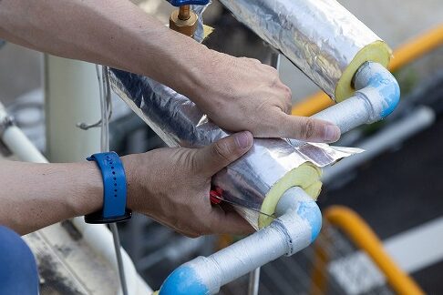 上原保温は、建物の配管やダクトに断熱材を施工し、熱気を入れない、冷気を逃がさない“保温、保冷工事”を行う専門業者です。チームでの作業が中心で、仕事が終われば早く帰れる「やり仕舞い」スタイルを採用。